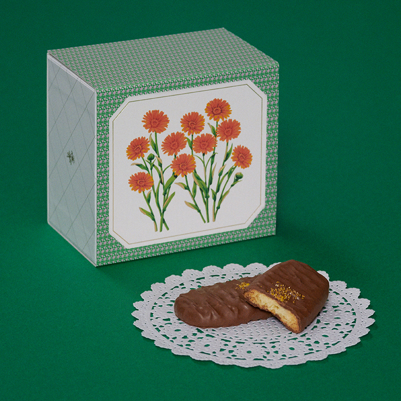 国産バターでくちどけよく焼き上げたお花型の生地の中心に、なめらかなチョコレートを入れたかわいらしい焼き菓子です。