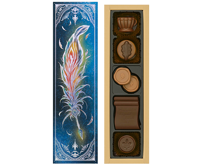 虹色の羽ペンが描かれた箱に、コーヒーや紅茶のチョコレートを詰め合わせました。