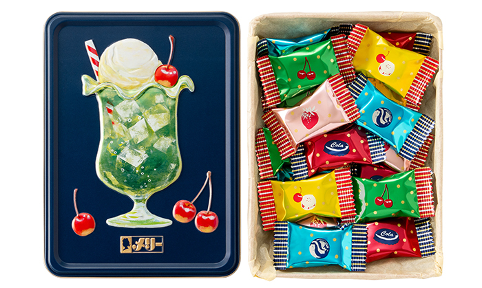 全種類のはじけるキャンディインチョコレートを、喫茶店のメニューをイメージした缶に集めました。