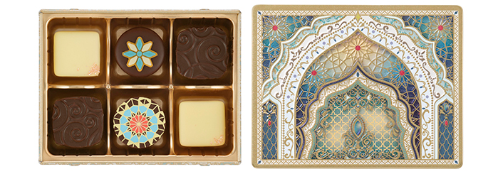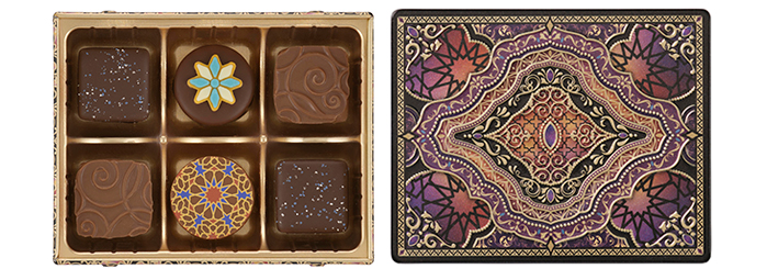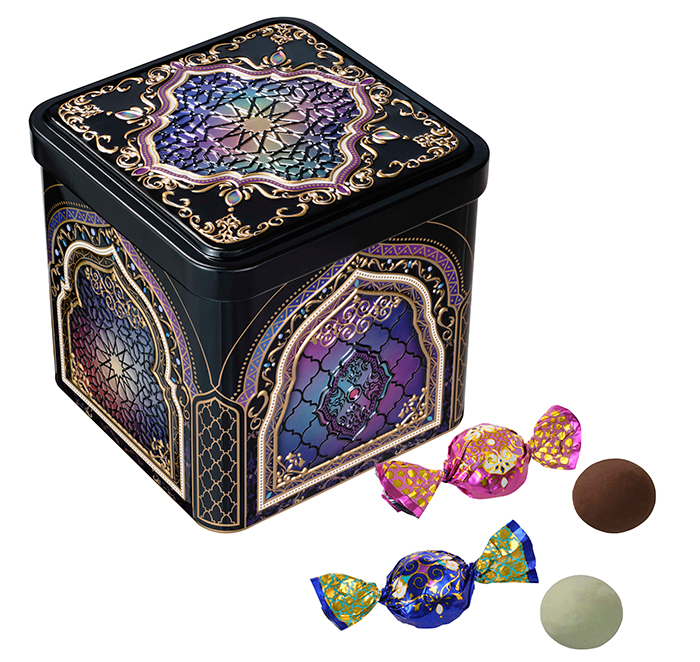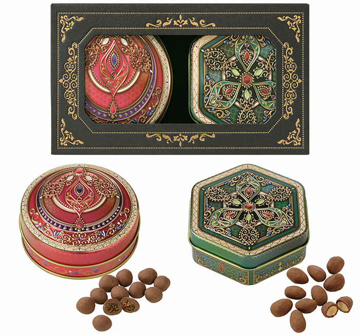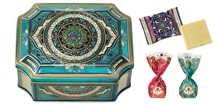 チョコレートを、キラキラの包み紙に包んでオリエンタルなデザインの缶に集めました。宝石箱を開けるようなわくわく感をお楽しみください。