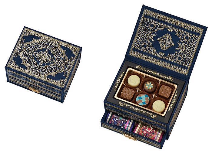 煌びやかで美しい質感の布の貼箱には、紅茶やカシューナッツ、ピスタチオなど、まるで宮殿で堪能するアフタヌーンティーのように、心ゆくまで楽しめるチョコレートを詰め合わせました。