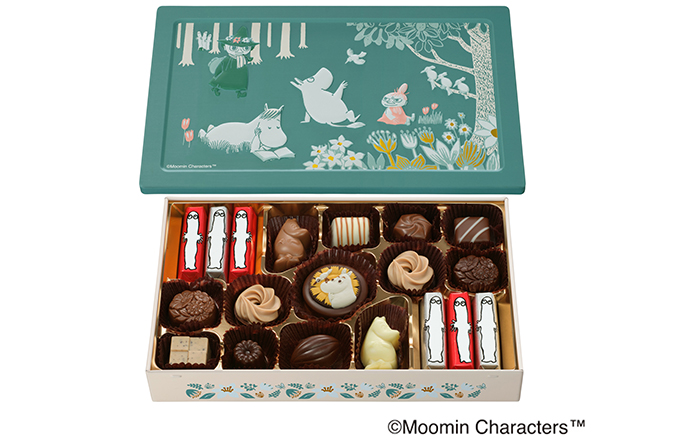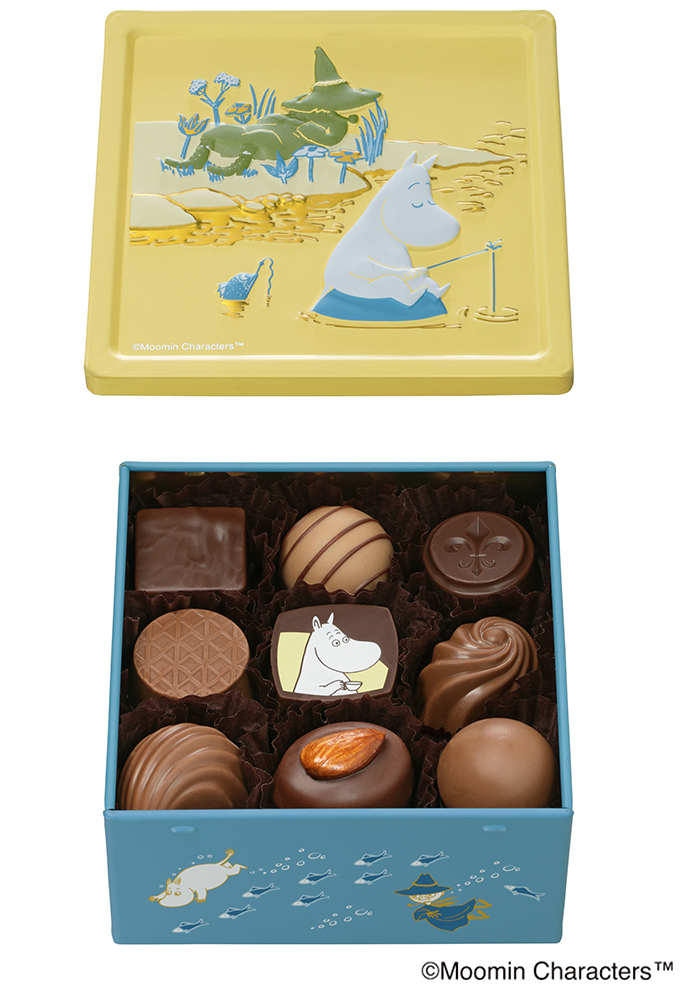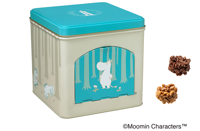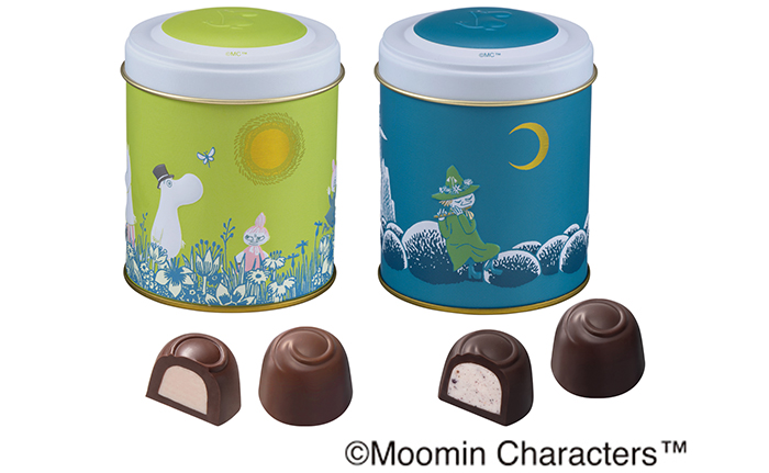 ムーミンたちが森の中でのんびりとした時間を過ごしている様子を描いた缶に、ニョロニョロやムーミンなどのチョコレートを詰め合わせました。