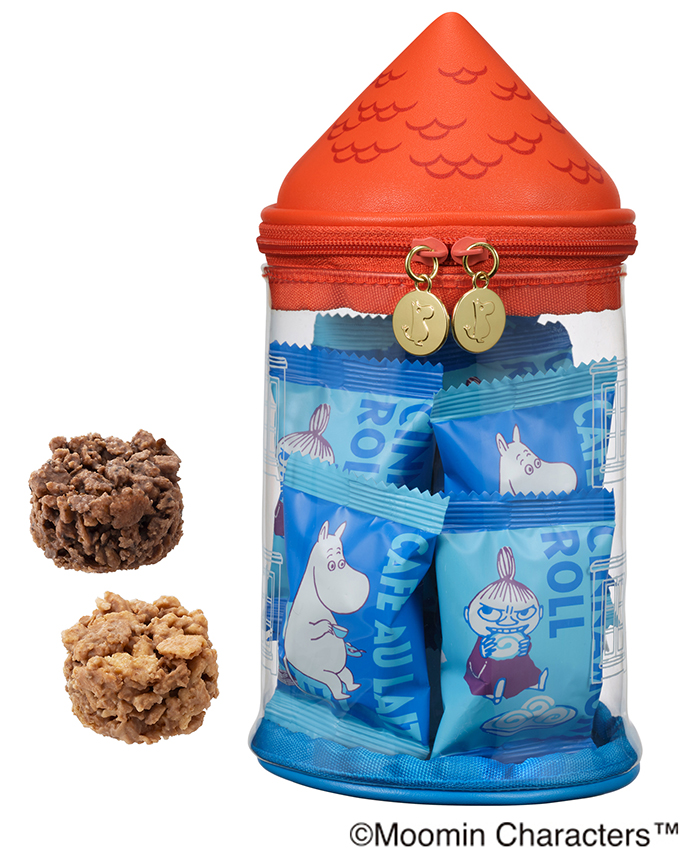 取り外し可能なストラップがついた、「吊るせる」「飾れる」2WAY仕様。ムーミンやしきをイメージしたポーチは中に入れるもので印象が変わり様々な楽しみ方が広がります。中にはカフェオレとシナモンロールをイメージしたクランチチョコレート入り。