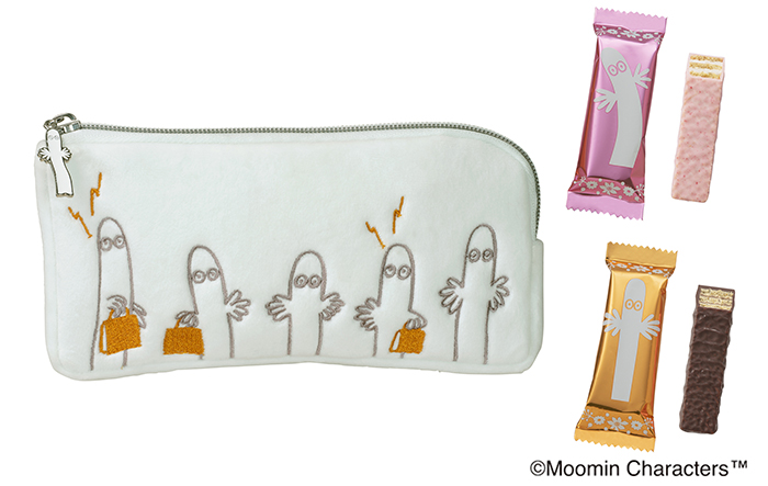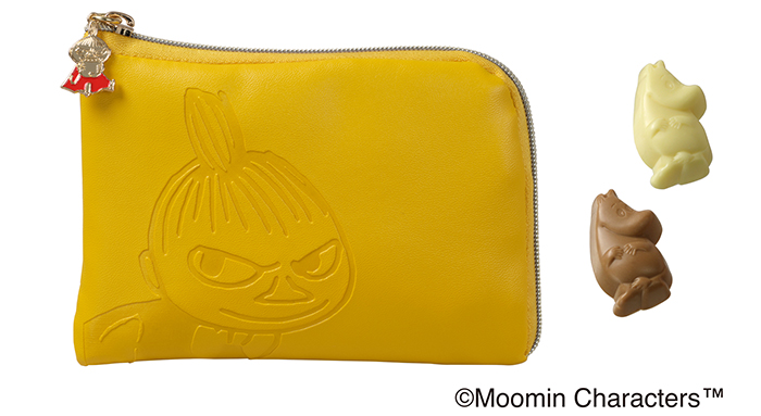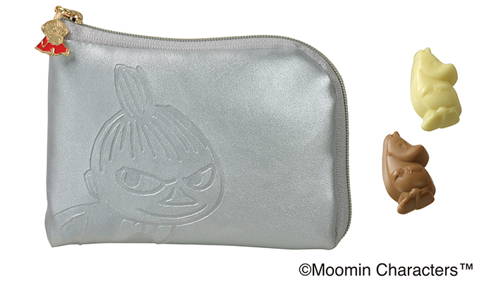 ムーミンの形をしたハイミルクチョコレートとホワイトチョコレートが入った、食べた後も楽しみなポーチです。