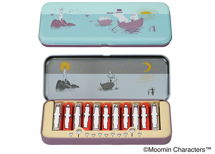 ムーミンの仲間たちがのんびりと過ごす姿を描いた缶ケースは上部の蓋と、側面にも扉がついていて開けることが出来る特別仕様。