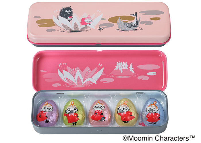 お花や草に乗って水面を散策するリトルミイたちを描いた缶に、いろいろな表情がかわいいリトルミイの包装紙で包んだパフインチョコレートを入れました。