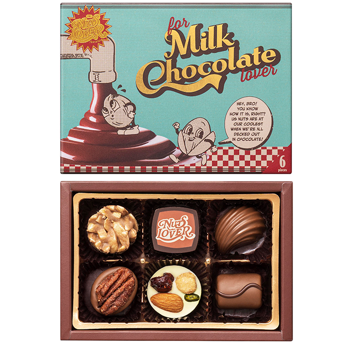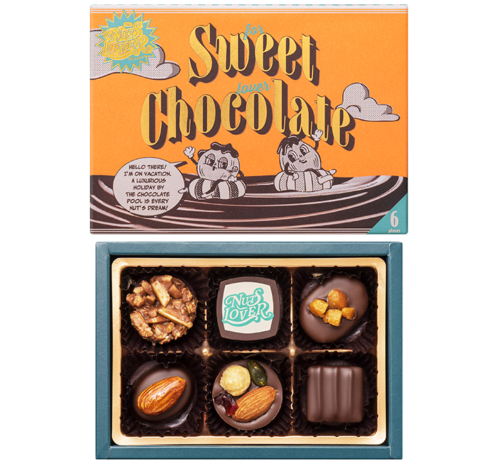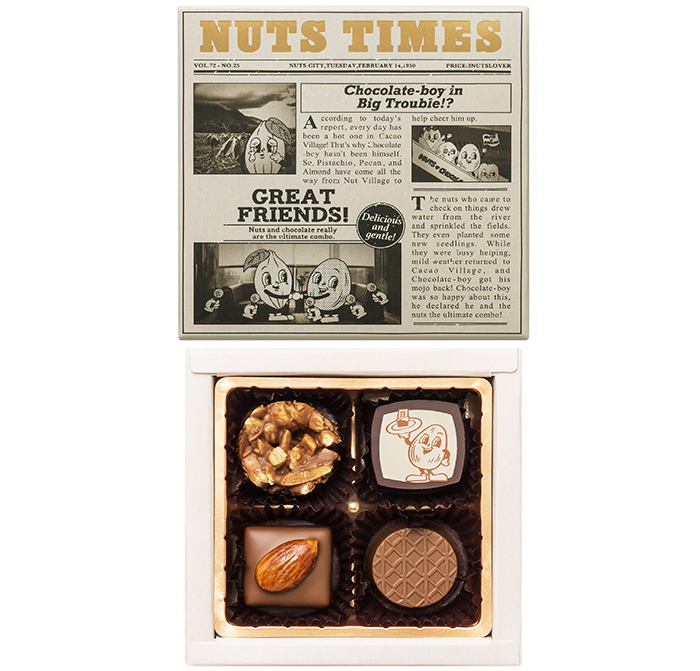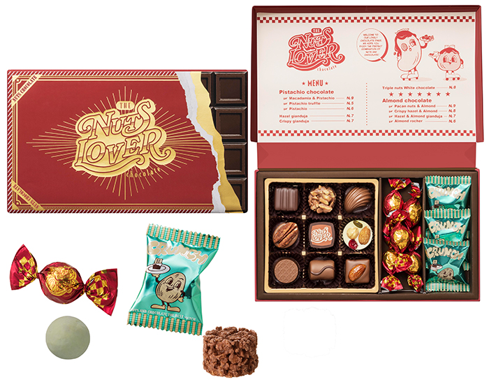 ナッツに特化したチョコレートを堪能できるバレンタイン専用のチョコレートです。アーモンドやペカンナッツなどいろいろなナッツを組み合わせ、様々な食感で仕立てたチョコレートの美味しさと、オリジナルキャラクターを登場させたポップ感とレトロさのある〈アメリカンレトロ〉の世界観で表現しました。
