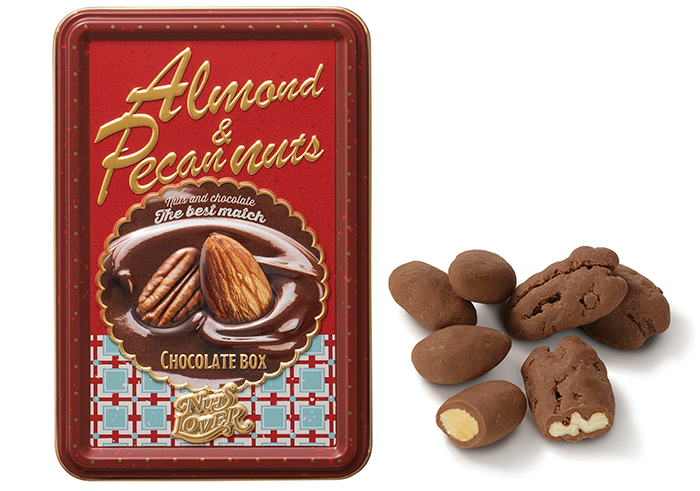 ほんのりとした甘みとコクが後を引くペカンナッツとカリッとしたアーモンドに、まろやかなミルクチョコレートをたっぷりとかけました。味わいの違う2種類のナッツとチョコレートのハーモニーをお楽しみください。手元に置いておきたくなるようなかわいい缶もポイントです。