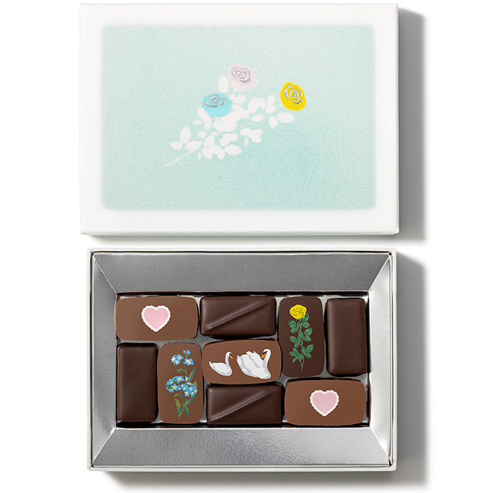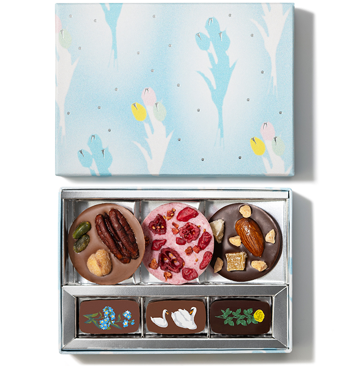 白鳥やお花をプリントした華やかなローズの香りや,ナッツの味わいのチョコレート。ナッツやベリー、レモンをトッピングした、彩り豊かなマンディアン。2種類のチョコレートを詰め合わせました。