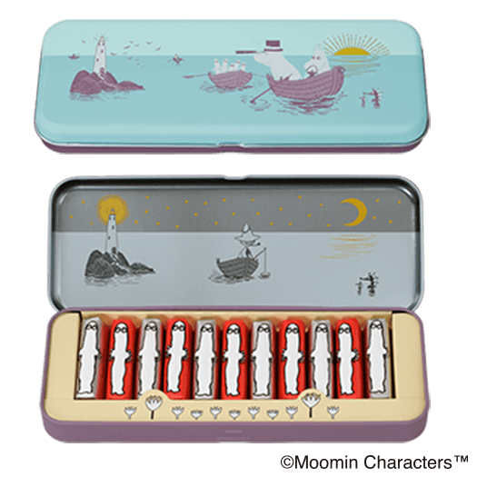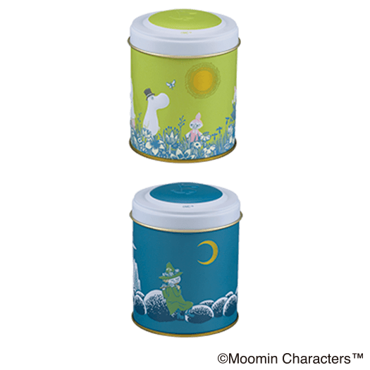 - ムーミン谷の朝と夜<br>(2種のチョコレート)ムーミンたちとムーミン谷の様子を描いた缶ケースに、<br>リンゴンベリーとブルーベリーの2種類のチョコレート入り。