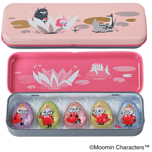 - リトルミイの水遊び<br>(パフ イン ミルクチョコレート)リトルミイたちを描いた缶に、リトルミイの包装紙で包んだ<br class='-pc'>パフインチョコレートを入れました。
