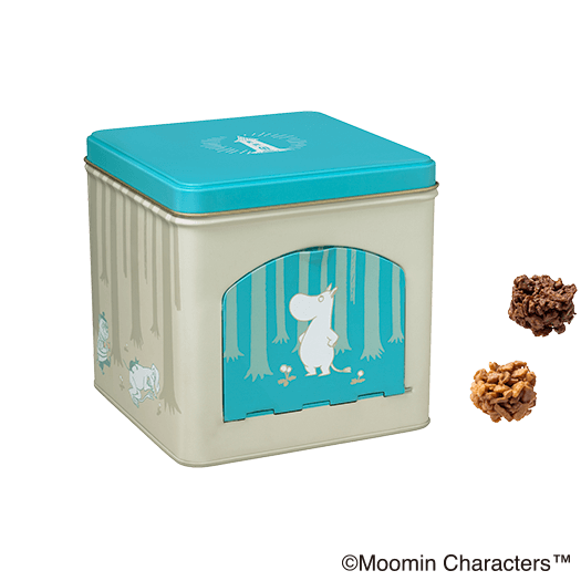 - 百貨店・駅商業施設・<br>オンラインショップ限定ムーミンと仲間たちのとびら缶<br>(2種のクランチチョコレート)ムーミンの仲間たちを描いた缶ケースにパンケーキとアップルパイをイメージした<br class='-pc'>2種類のクランチチョコレート詰め合わせ。