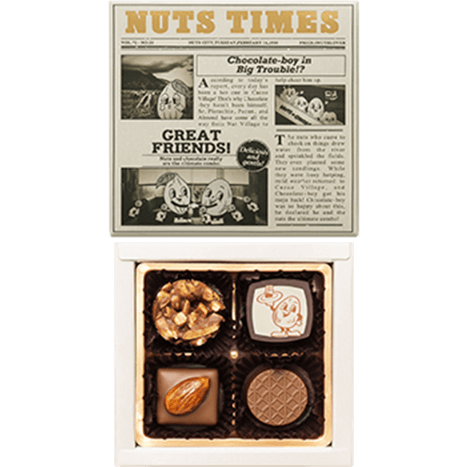 - アーモンド&ヘーゼルナッツラバーナッツの定番アーモンドとヘーゼルナッツなどを使った4種類の味わいが楽しめるアソート。 香り高いヘーゼルナッツのペーストをスイートチョコレートに合わせたジャンドゥヤ、<br class='-pc'>クラッシュしたアーモンドの食感が楽しめるロシェなどをお楽しみいただけます。