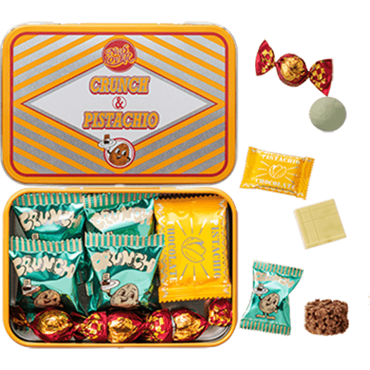 - クランチ&ピスタチオボックスサクッとした食感が楽しいアーモンド&ミルクチョコレートクランチ、<br class='-pc'>まろやかなピスタチオトリュフ、香ばしいピスタチオの風味感じる<br class='-pc'>スクエアチョコレートが入ったボックス。<br class='-pc'>黄色と赤のストライプ柄がおしゃれな蝶番付きの缶です。