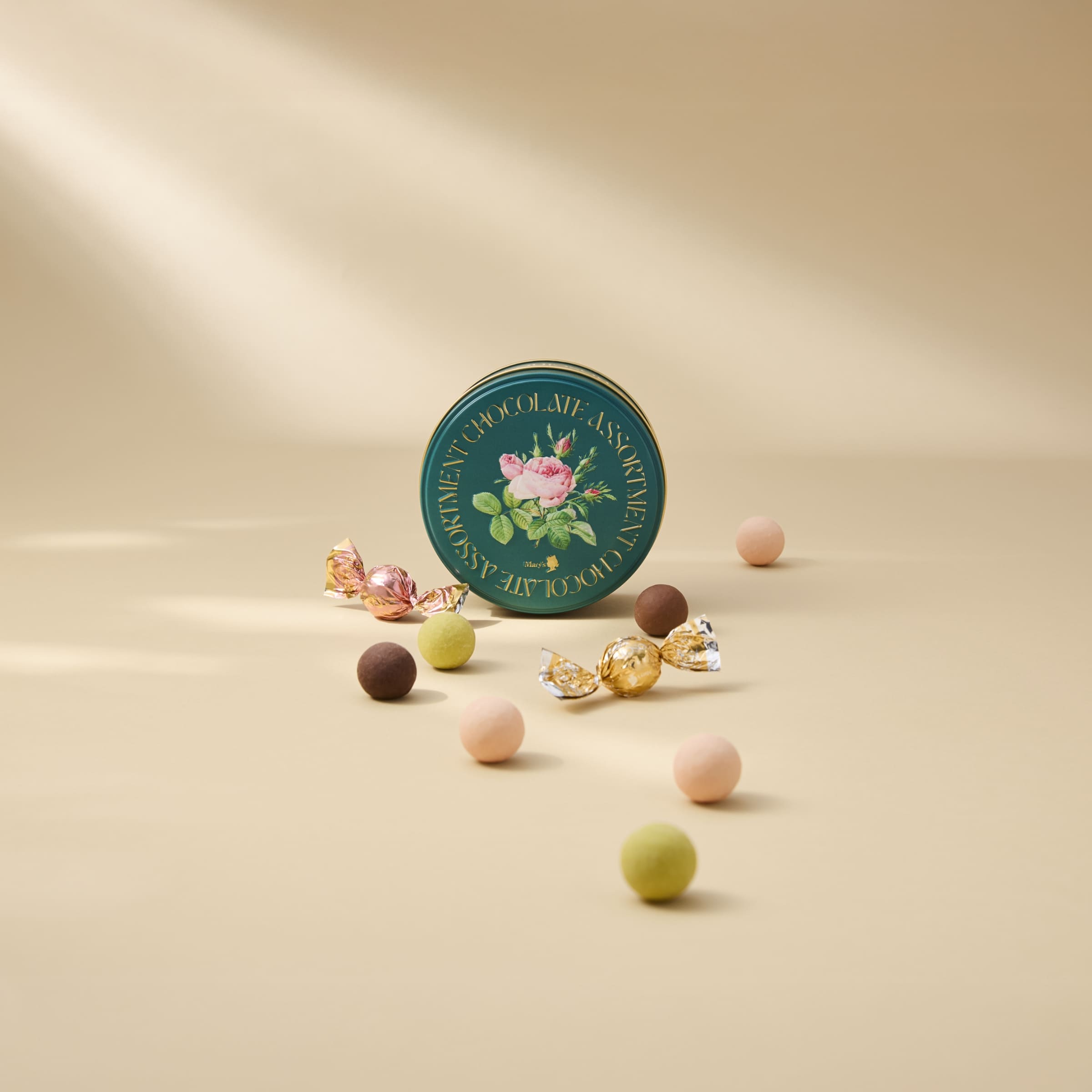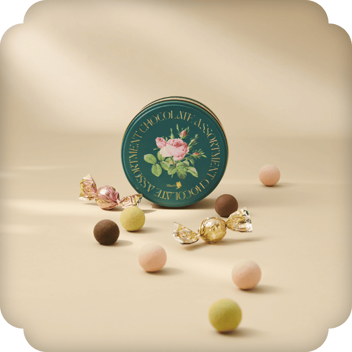 キラキラと輝く個包装に包まれた4種類のチョコレート。 ピスタチオ、ストロベリー、紅茶、そしてミルクとスイートふたつのチョコレートを一度に味わえるダブルチョコレートを、ころんと丸いひと口サイズに仕立てました。